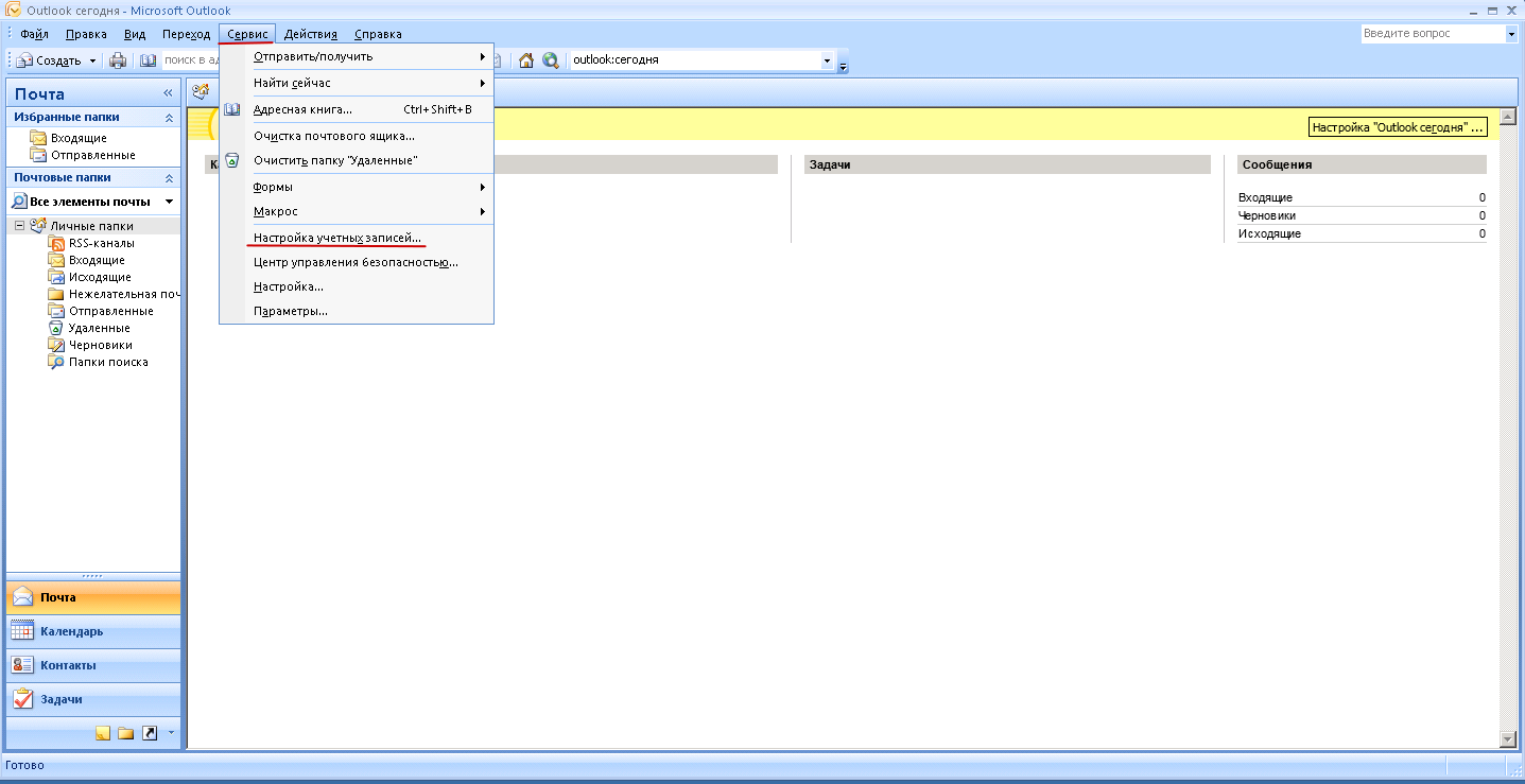 1. В программе почтового клиента outlook нажимаем на кнопку сервис, в выподающем списке выбираем Настройка учетных записей